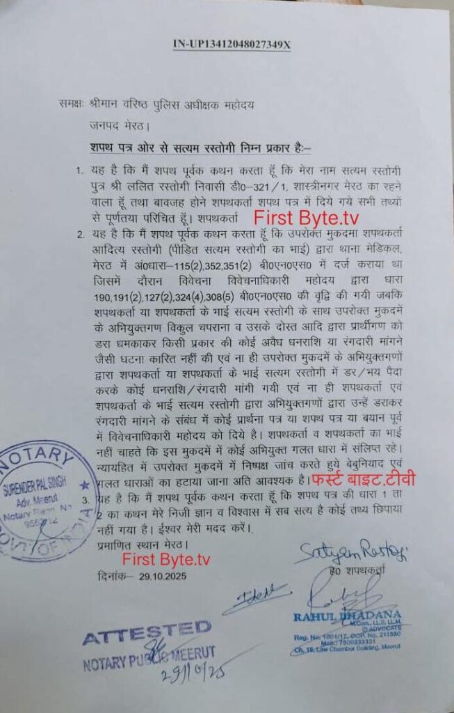 मेरठ। शास्त्रीनगर के बेहद चर्चित “नाक रगड़ाई प्रकरण” पर आज विराम लग गया। कैंट विधायक अमित अग्रवाल व अन्य भाजपा जनप्रतिनिधियों की मौजूदगी में सत्यम रस्तोगी ने यह शपथ पत्र दे दिया कि उससे कोई रंगदारी नहीं मांगी गई थी। इससे अब विकुल चपराना की जमानत होने का मार्ग प्रशक्त हो गया है। भाजपा नेताओं के भारी दबाव के बाद ही पुलिस ने जमानत पर रिहा विकुल चपराना पर रंगदारी की संगीन धारा भी लगा दी थी। इसी आधार पर विकुल को दोबारा से गिरफ्तार कर जेल भेज दिया गया था।